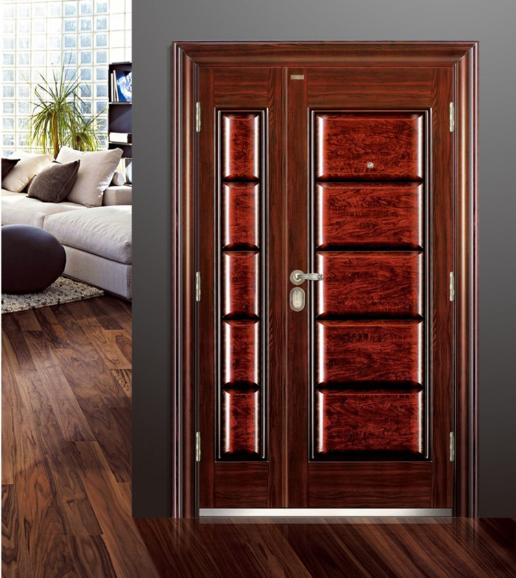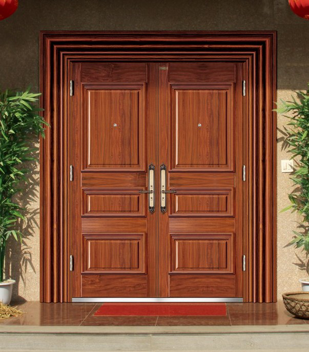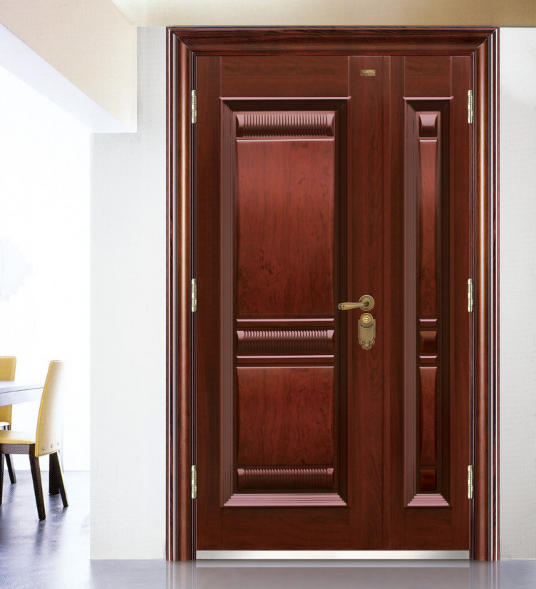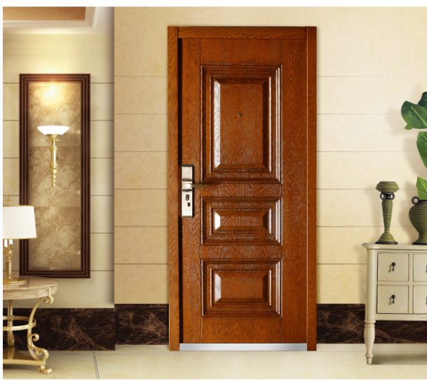 以木片包裹钢板制成,中间的钢板起到防盗的效果,因为表面覆盖木片,可选择不同颜色、纹理、线条,装饰效果较好,但是价格较高,撞击后会在门板上留下坑洞痕迹。